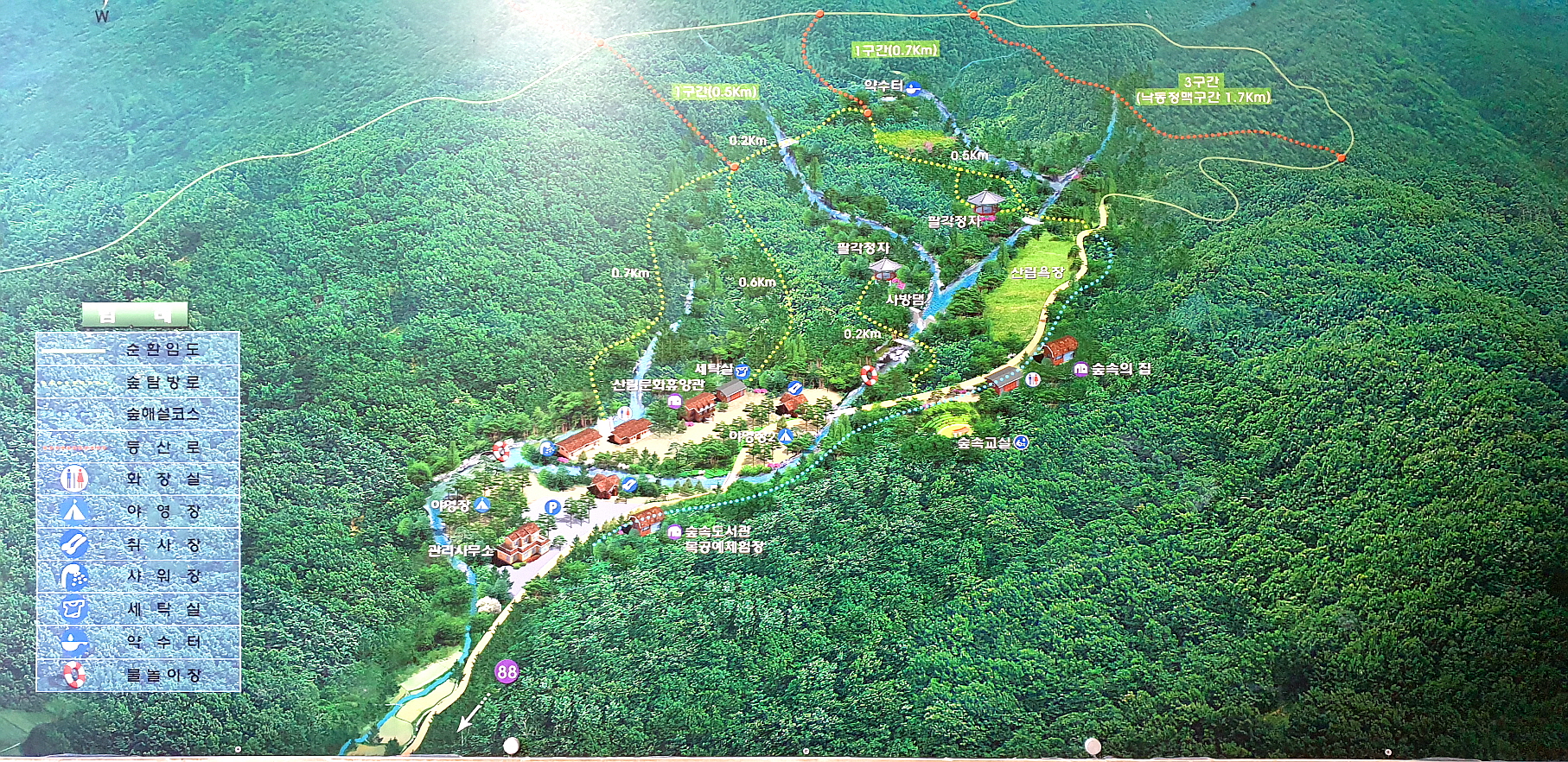 2013년도에 개축한 산림문화휴양관(16객실)과 야영장(24면)을 운영하고 있고