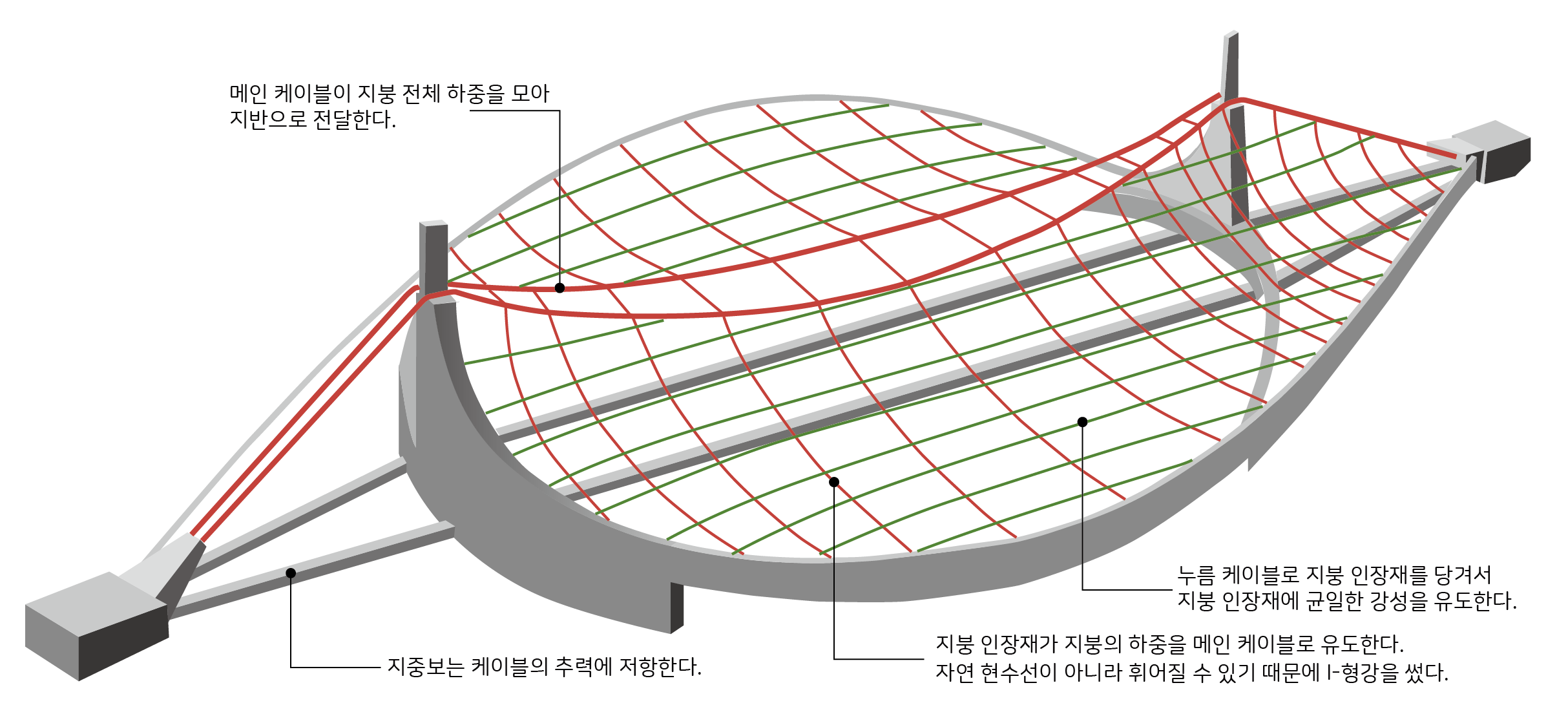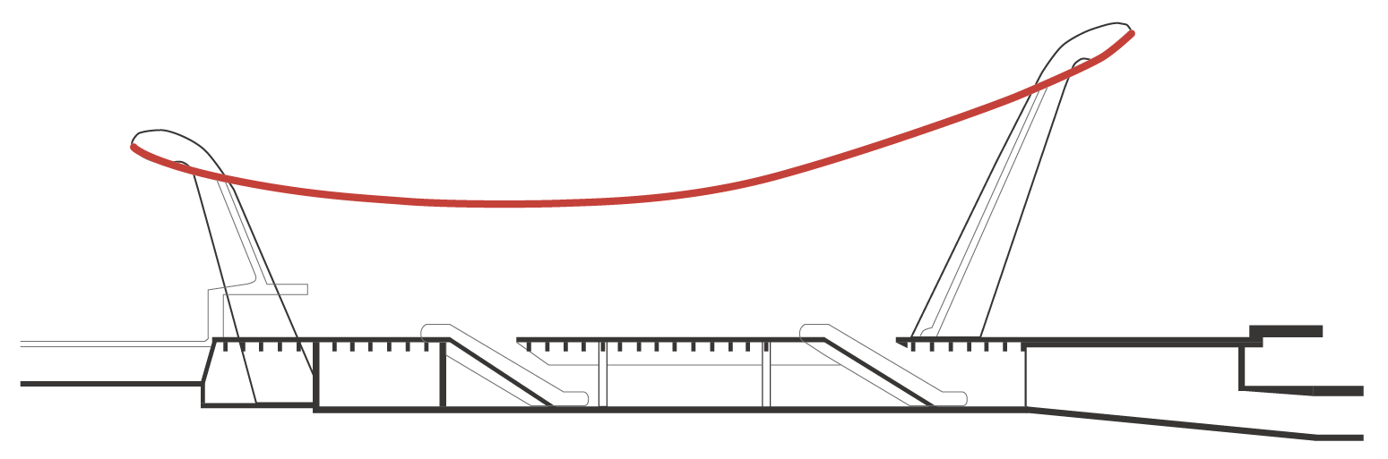 메인 케이블에서 44m 정도 떨어진 콘크리트 관람석 벽체에 케이블을 연결하면 아래로 휘어지는 현수선이 생깁니다. 그런데 건축가는 현수선보다는 더 날렵한 모양을 원했습니다. 이 곡선을 만들기 위해 Ⅰ-형강을 사용해서 연결했는데 이렇게 하면 Ⅰ-형강에 휨 응력이 부수적으로 생기게 됩니다.
