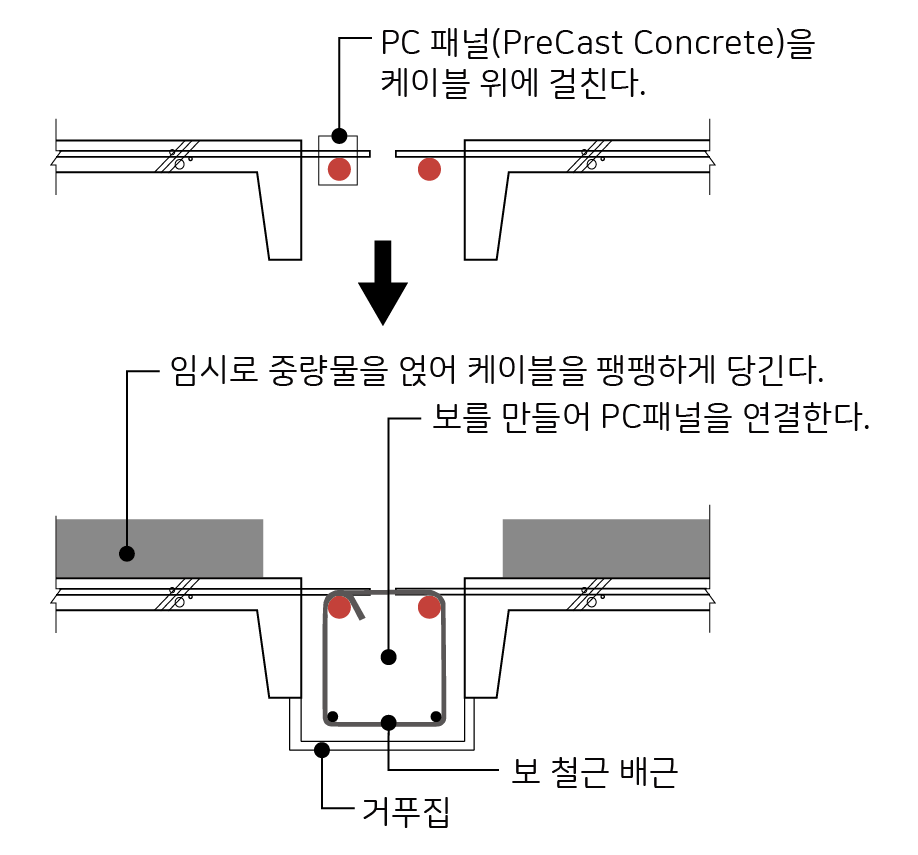 무거운 콘크리트로 지붕을 덮은 것이죠. 팽팽하게 당겨진 케이블 위에 PC 패널(Pre-cast Concrete; 공장에서 만든 콘크리트 판)을 걸친 후 현장에서 콘크리트를 타설하는 방법으로 패널을 연결했습니다. 그런데 보를 만들어 PC 패널을 연결하기 전에 케이블이 충분히 당겨져야 최종 현수선 형태를 만들 수 있다. 이것을 해결하기 위해 임시로 중량물을 얹어 케이블을 팽팽하게 당긴 후 PC 패널을 연결했습니다.