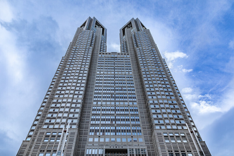 New Tokyo City Hall Complex는 Tange Associates가 설계 한 수십 개의 정부 프로젝트 중 첫 번째 인 1957 년 도쿄 도청을 대체했습니다. 새로운 복합 2 개의 고층 빌딩과 의회당은 도쿄 시청 홀 타워 1에 의해 지배되고 있습니다.