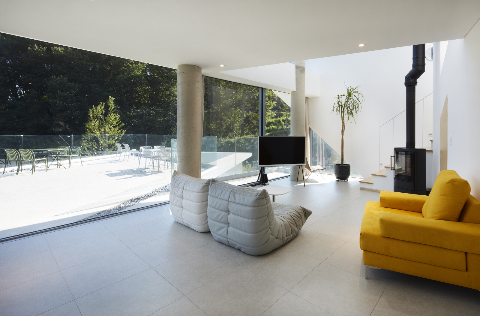하얀 벽의 질감은 아침부터 저녁까지 시시각각 변화하는 빛을 느끼게 해주고, 건물의 구조를 그대로 드러내며 열어 놓은 빈 공간들은 사계절의 변화를 담는 프레임으로 기능한다.