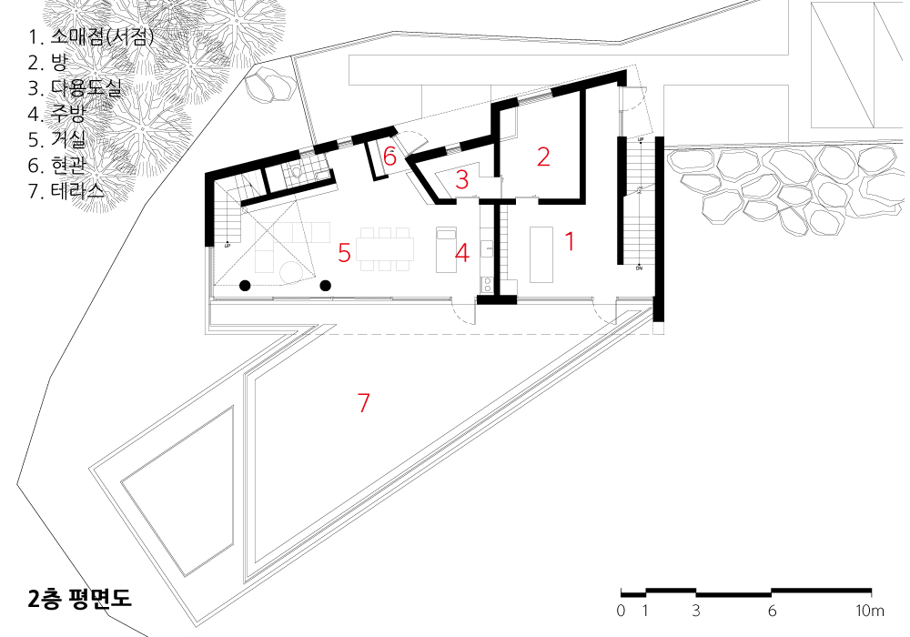 한때 시인이었던 건축주는 자연 속에 서점을 만들고 싶어 했다. 도심에서나 볼 수 있었던 동네 서점을 산속에 두는 상상을 늘 해왔다. 혼자 보기 아까운 비경을 기꺼이 사람들에게 나눠주고 누구나 와서 쉬다 가는, 오감으로 책을 만나고 경험하는 ‘서가’를 꿈꿨다.