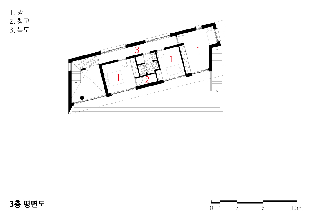 평지에 비해 불리한 조건이었던 대지, 높이차에 대한 해결책으로 2층으로 진입하는 주출입 동선, 그리고 축을 달리하는 각층 매스의 조합을 떠올렸다.