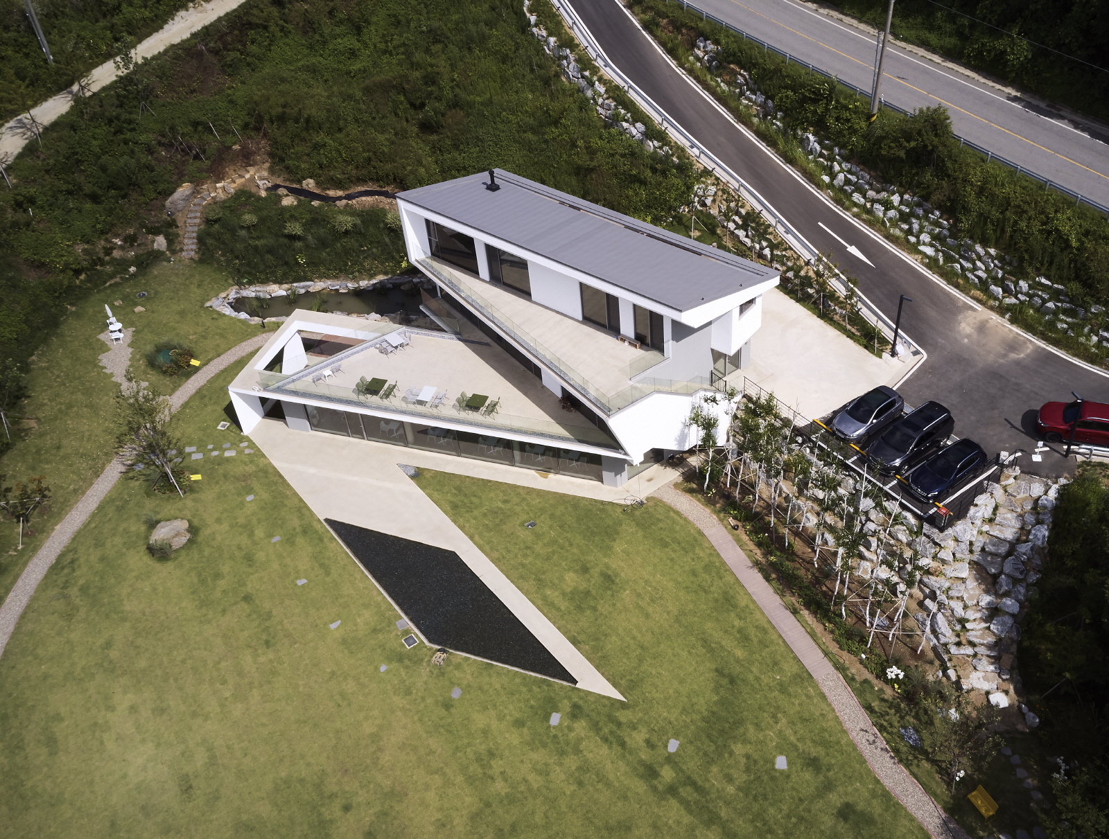 The site located at a corner passed from Anseong to Jincheon used to be flat rice paddies created artificially on the top of the mountain and have a height difference of 7-8m from the road. The site overlooks the magnificent scenery of unknown mountains spreading towards the south. This project started with the question of how to establish a building that adapts itself to nature, overcoming the difference in height between the road and the site.