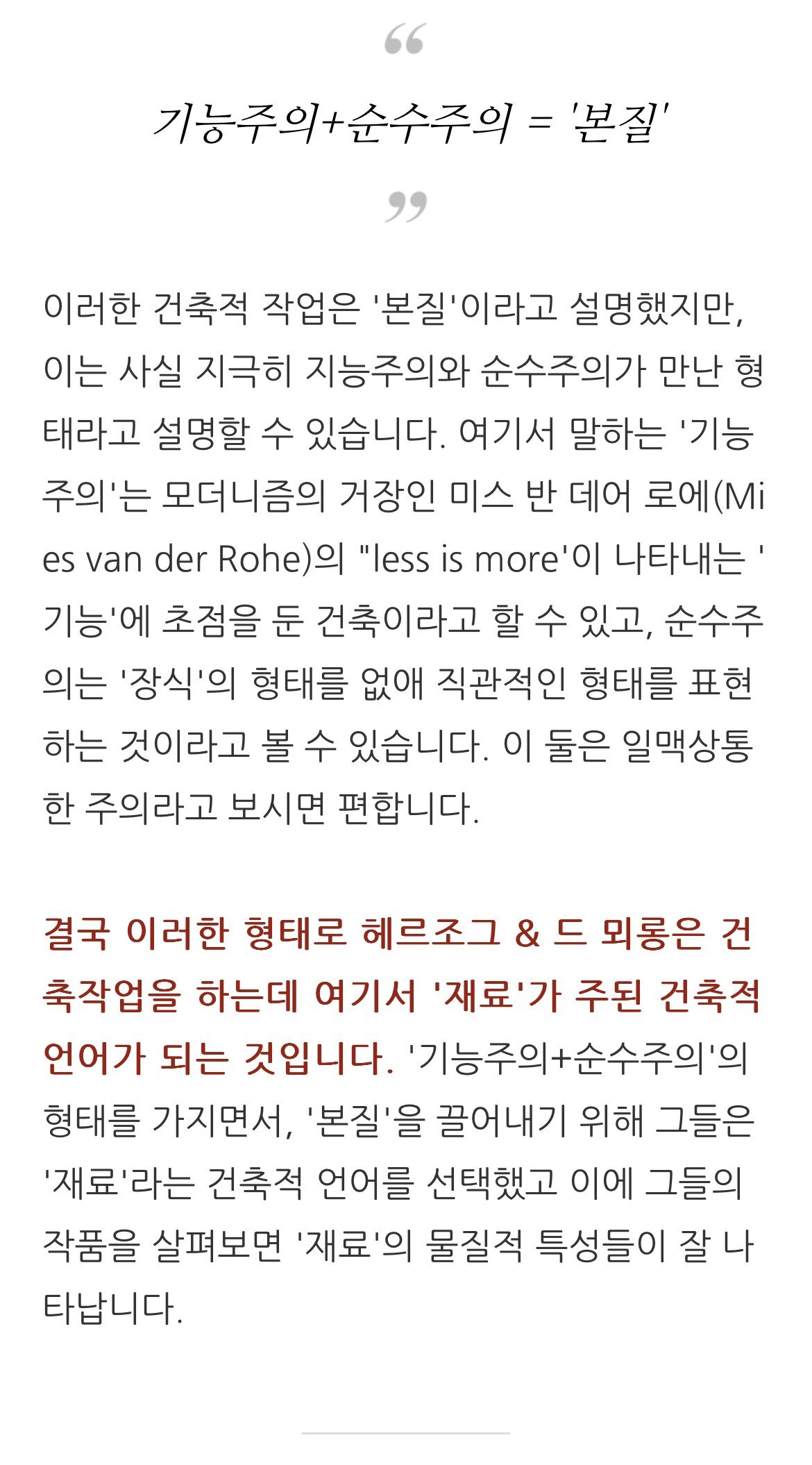 헤르초크: 정신분열증은 아니다. 아마 역설일 듯? 그 건물은 인습을 타파하는 면이 있고 동시에 아주 생기가 있다. 기묘하게 매력적이어서 우리가 세운 가장 아름다운 건물로 꼽을 만 하다.