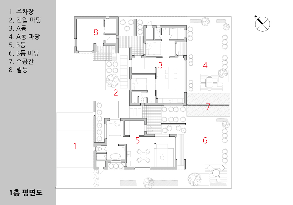 3개 동으로 이루어진 건축물은 하나의 조형이면서도 각 동이 완전히 분리되어야 했다. 전면의 컨시어지동과 2개의 독채는 주출입부 중정을 공유하며, 이곳을 중심으로 골목길처럼 나누어진 길을 따라가다 보면 프라이빗한 각 동의 현관에 다다르게 된다. 대지의 후면을 향하는 2개 동의 정원은 같은 방향을 바라보지만, 하부가 오픈된 독립 구조물과 수공간으로 인해 서로의 시선적 프라이버시를 확보한다.