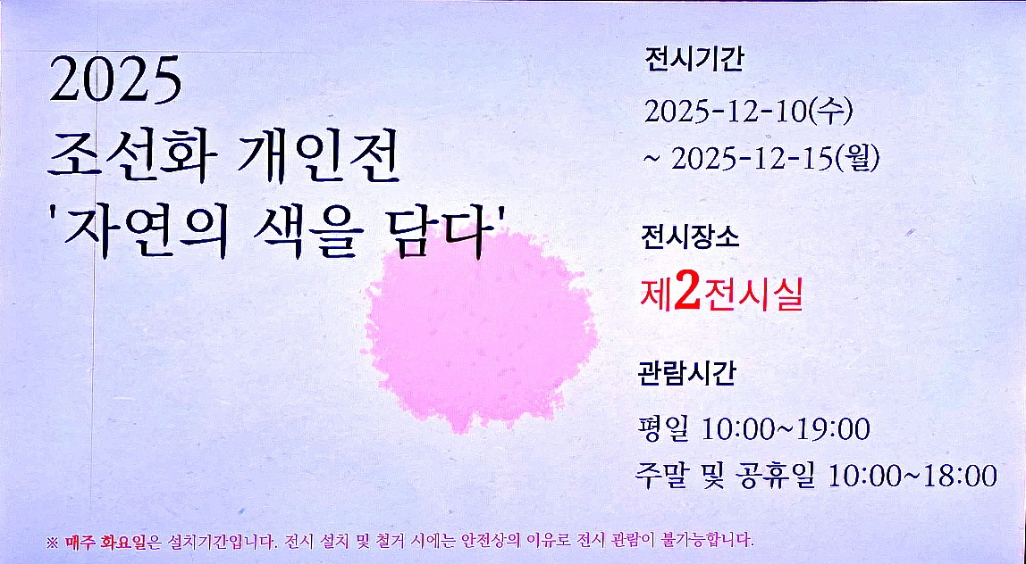 전시 제목은 ‘조선화 개인전’이지만, 보다 구체적인 부제로 「자연의 색을 담다」가 제시되어 있습니다. 이 부제는 곧 전시의 주제 의식을 함축하는 표현으로, 자연이 지닌 다층적인 색감을 수채화 매체를 통해 번안하는 과정 자체가 전시의 핵심이라는 점을 드러냅니다. 자연의 형상적 재현에서 나아가, 색이 전달하는 정서와 기억, 그리고 계절의 리듬을 시각적으로 기록하는 작업이 전반을 이끈다고 이해할 수 있습니다.인스타그램+3