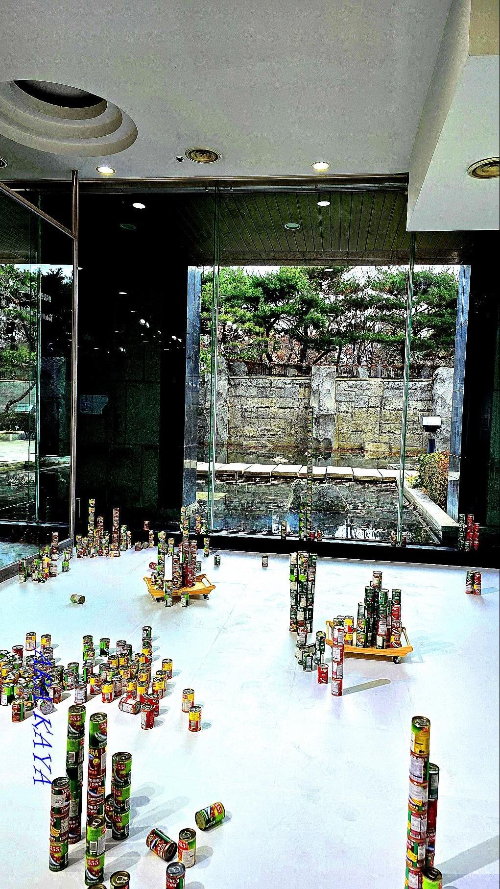 - 약 1,000개의 통조림 캔을 활용한 대규모 설치 작업으로, 비워진 캔·채워진 캔이 반복적으로 쌓이고 배치되며 관계의 이동과 순환을 시각화합니다.다움
