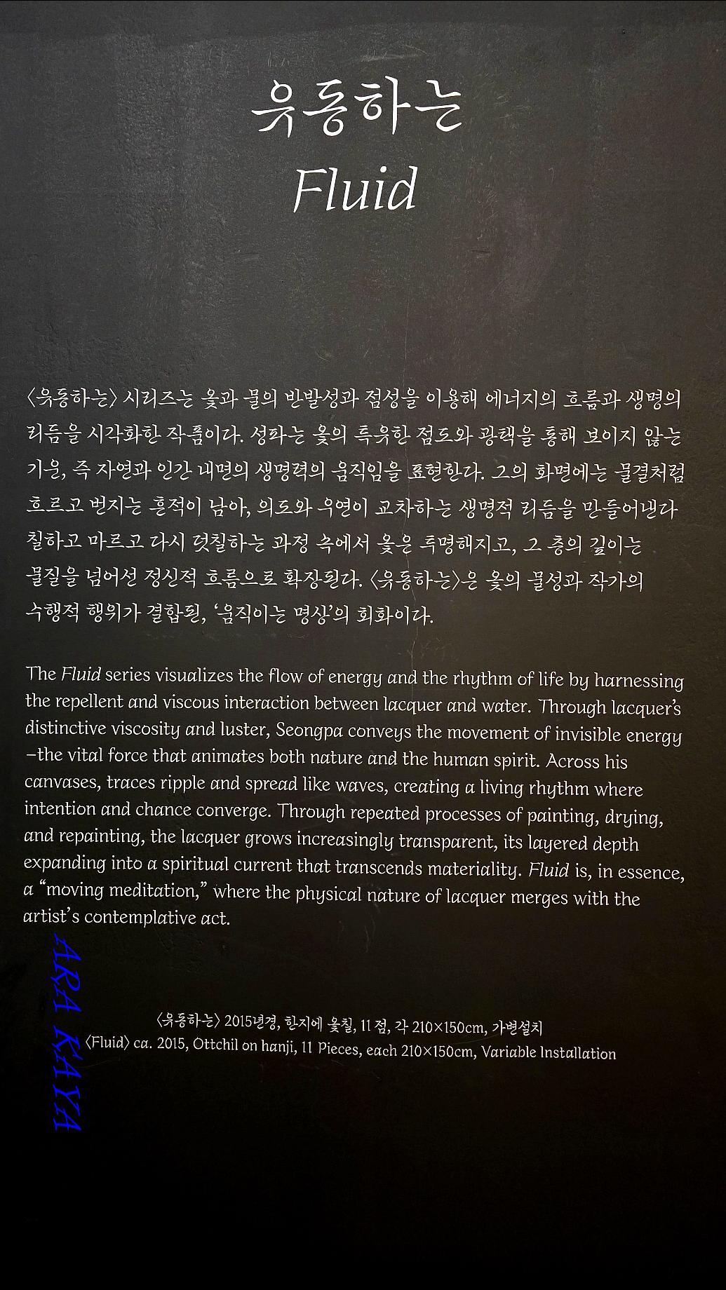 대한불교조계종 종정·통도사 방장 성파스님의 대형 설치와 수중 회화가 1층 1·2전시실을 채웁니다. 대표작 '유동하는'·' 물속의 달'·' 태초에'·' 꿈' 등은 종교적 수행과 예술 창작이 융합된 독창적 세계를 드러내며, 옻의 투명성과 깊이로 무상·공의 철학을 시각화합니다. 수행 속에서 빚어진 작품들은 빛의 굴절과 옻층의 중첩으로 관람자에게 명상적 체험을 제공합니다.MCST+2