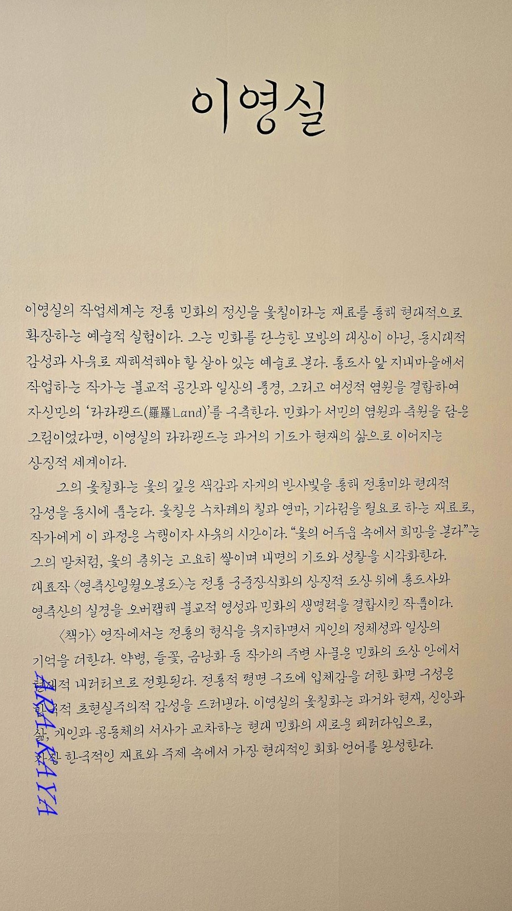 | 김미숙 | 추상회화·신작 설치 | 옻칠 + 혼합매체(직물·금속) | 감각적 색변화 강조, 신작 공개로 현대적 확장. 이영실과 유사하나 더 물질 실험적. |