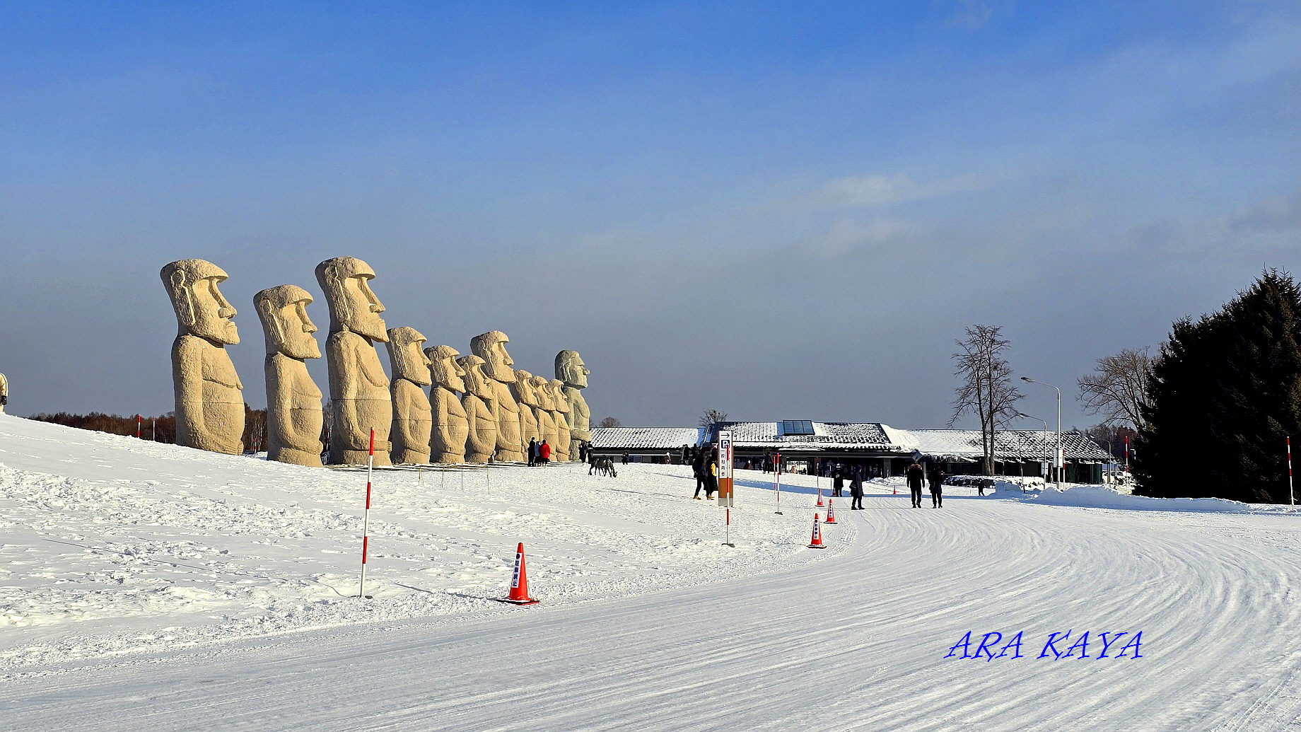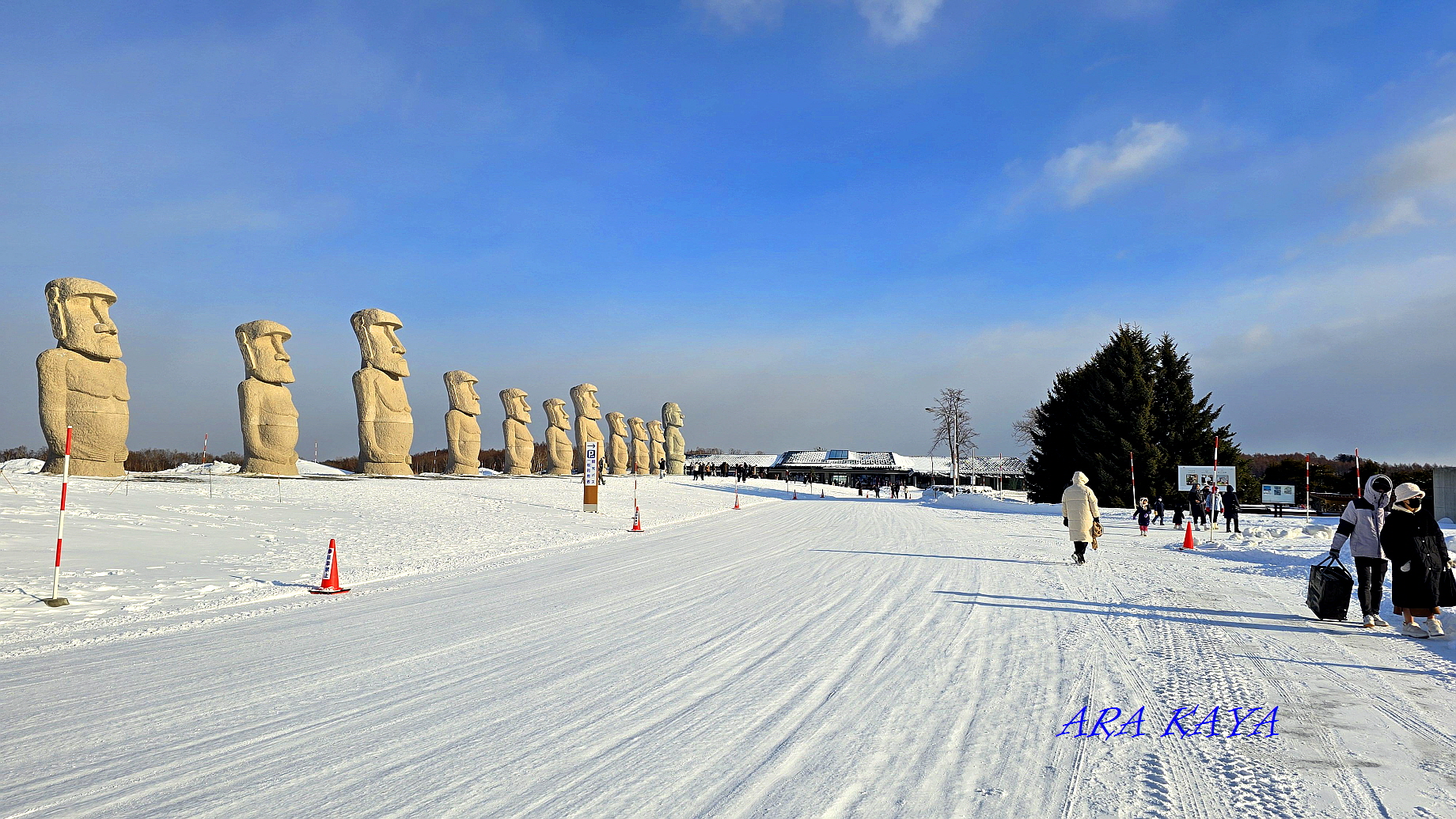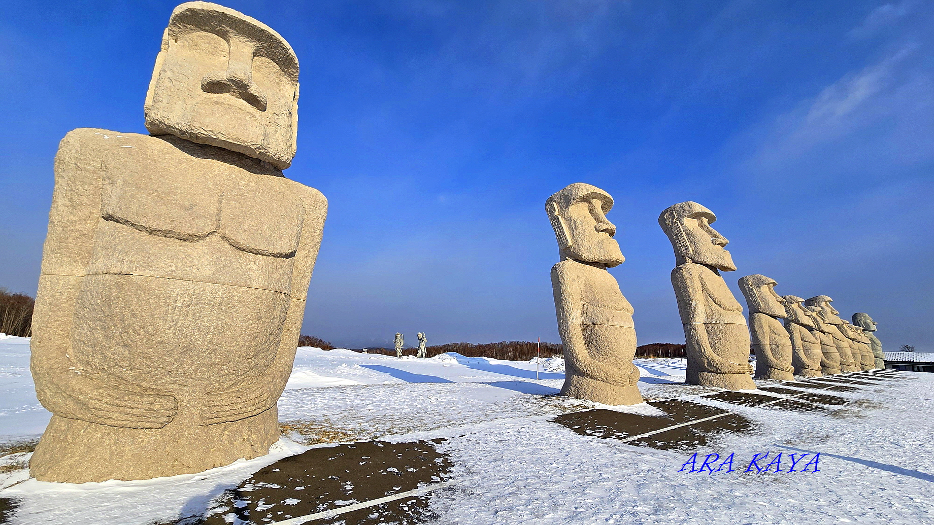 모아이상들은 도로변을 따라 길게 줄지어 서 있으며, 크기와 형태가 다양해 원근법적 압도감을 줍니다. 가장 큰 것은 높이 9.5m, 무게 120톤에 달하는 거대 석상으로, 중형(높이 6.5m, 무게 60톤)과 소형이 섞여 배치되어 전체적으로 장관을 이룹니다. 재질은 화강암 등 홋카이도 현지 자연석을 깎아내 제작되었으며, 길쭉한 타원형 얼굴에 무표정한 입매, 직선적으로 팔을 몸통 옆에 붙인 포즈, 두 손을 공손히 모은 실루엣이 특징입니다. 일부 석상은 남성적 각진 턱선이나 여성적 부드러운 곡선으로 변형되어 원형 모아이의 신비로움과 인간성을 강조하며, 표면의 거칠고 투박한 질감이 눈·바람·비 등 혹독한 홋카이도 기후에 견디도록 설계되었습니다. 겨울철 눈 쌓인 모습이나 여름 라벤더와의 대비가 특히 사진적으로 인상적입니다.sparkle+5