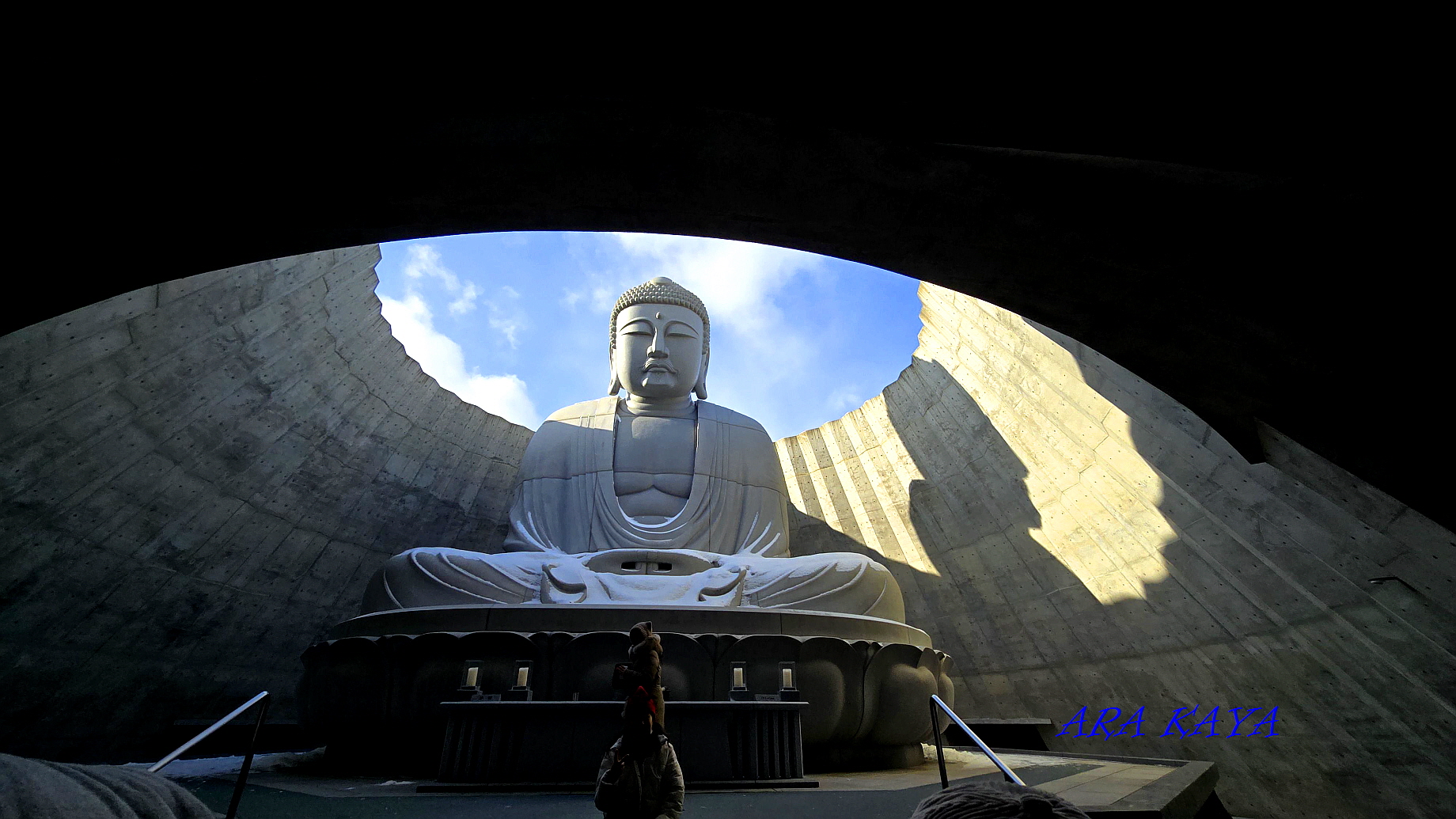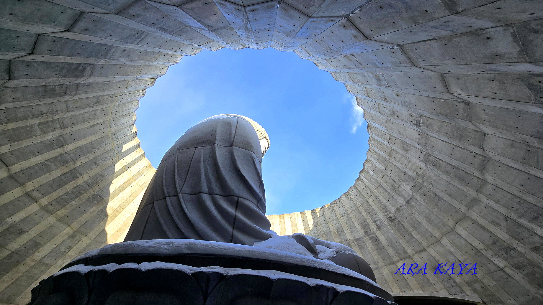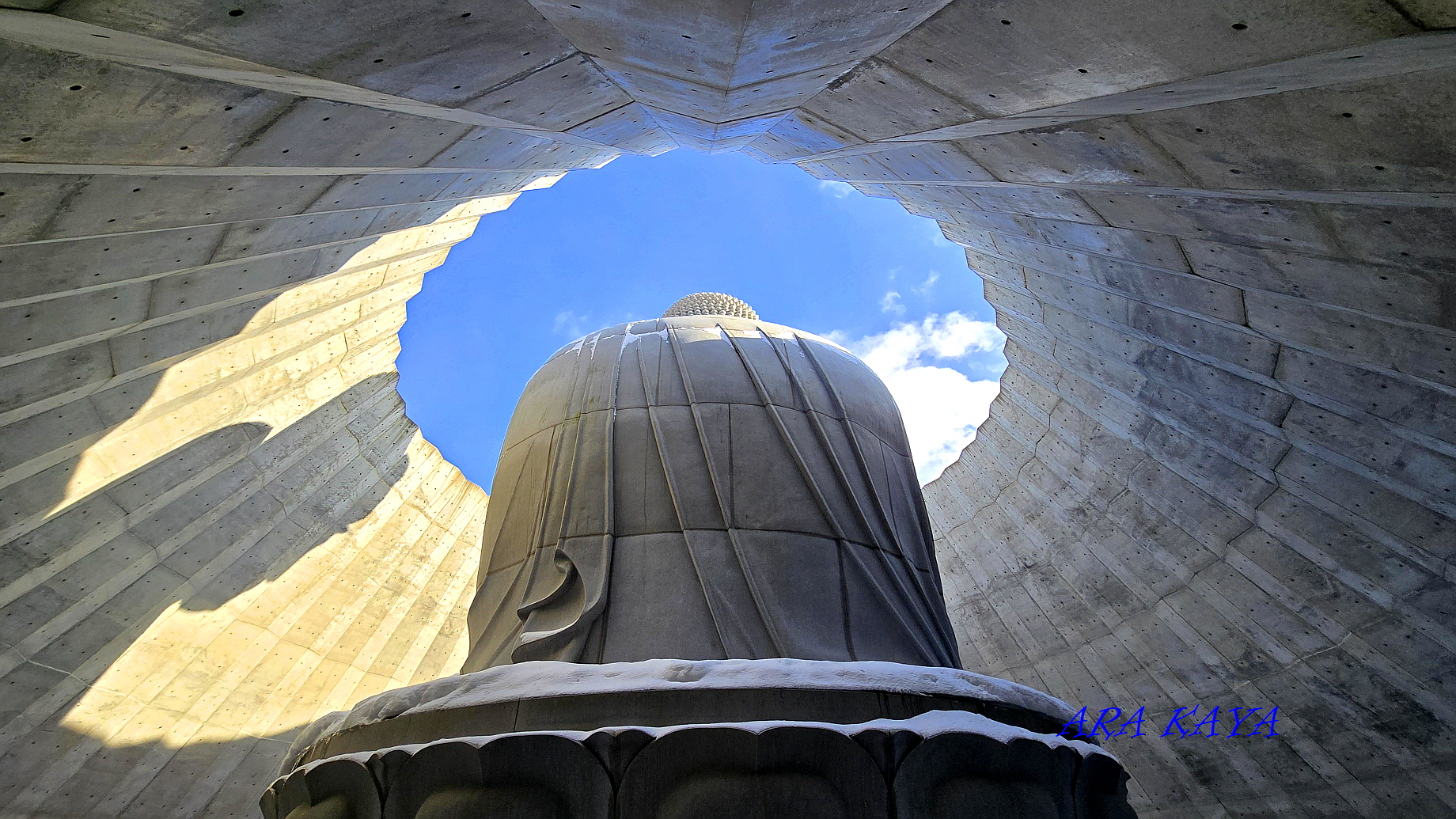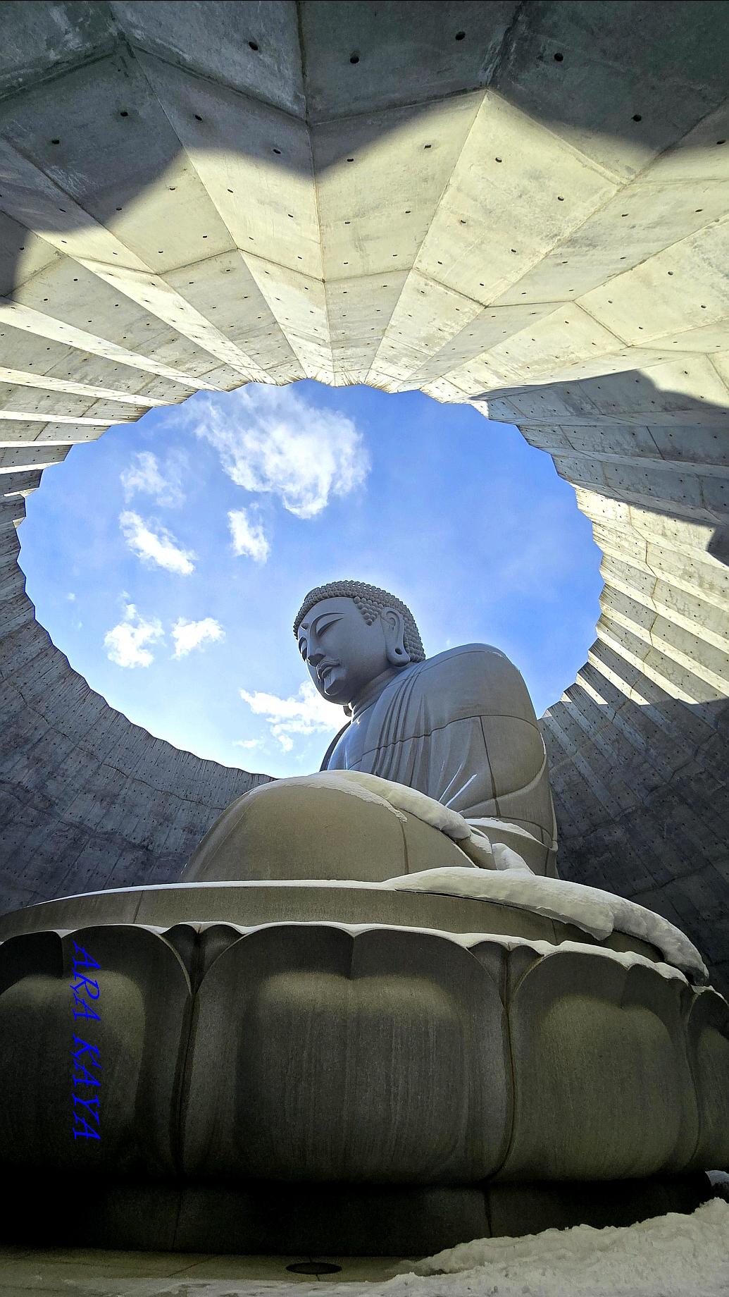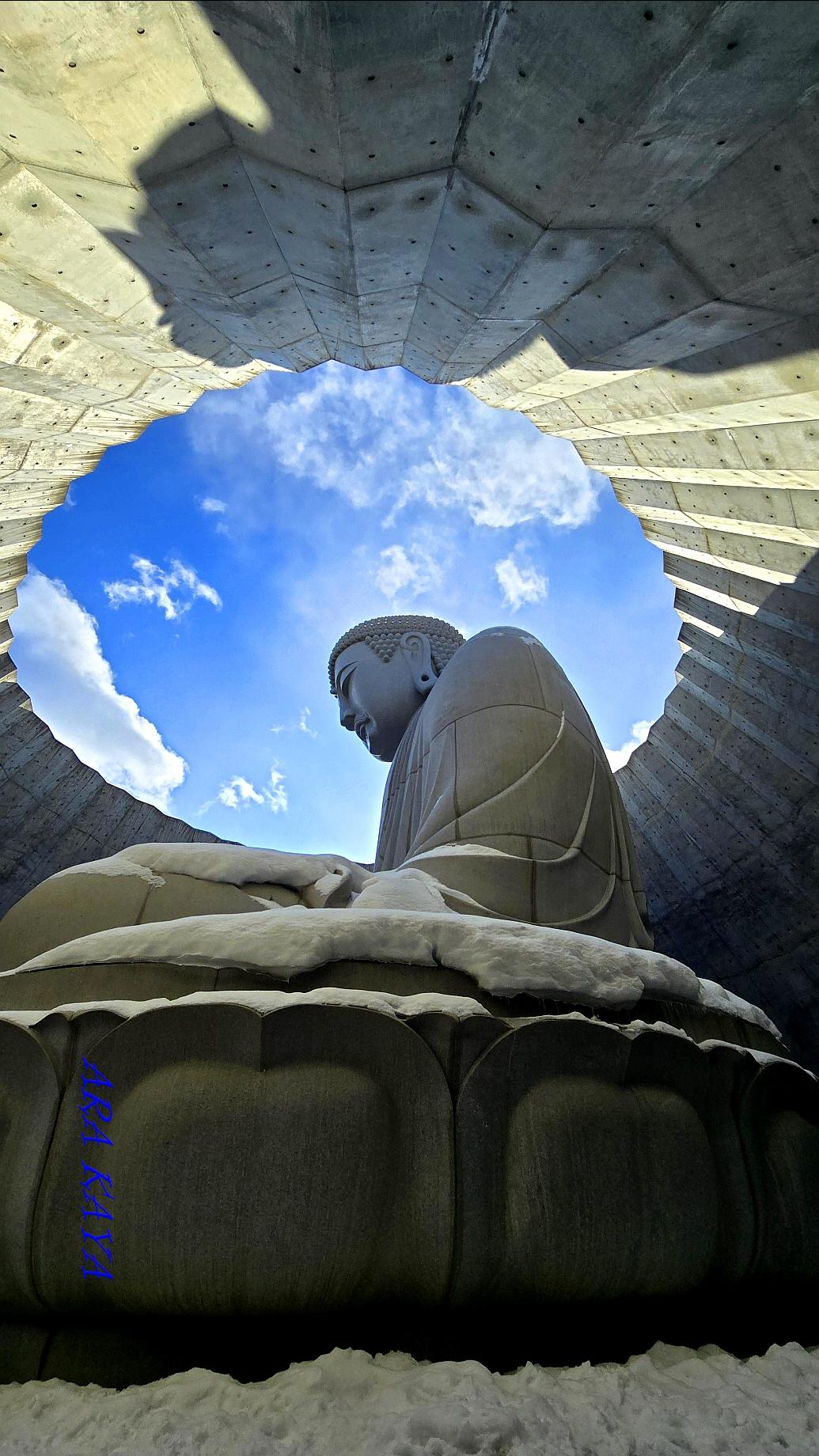이 불상의 독특한 점은 언덕 위에 머리 부분만 살짝 드러나 보이도록 설계된 ‘머리 대불’(日本어로 ‘あたま大仏’, 두대불)이라는 점입니다. 한 걸음씩 걸으며 긴 터널을 지나 대불에 접근하게 되는 공간 연출은 안도 타다오 특유의 빛과 어둠, 개방과 폐쇄의 조화로운 연출법이 돋보입니다. 방문객은 대불을 마주하는 순간 깊은 감동을 받게 되며, 불상 너머로 펼쳐지는 자연 풍경과 하늘과의 조화도 아름답습니다.방문.삿포로+1