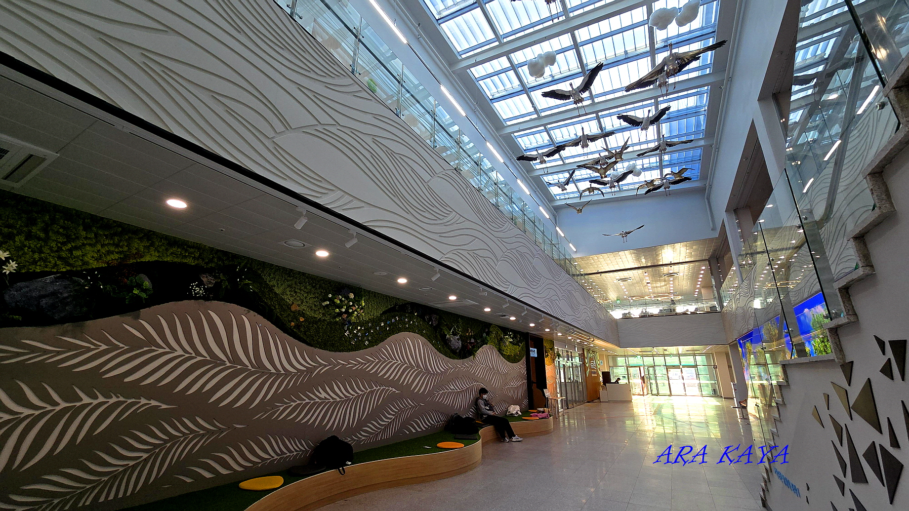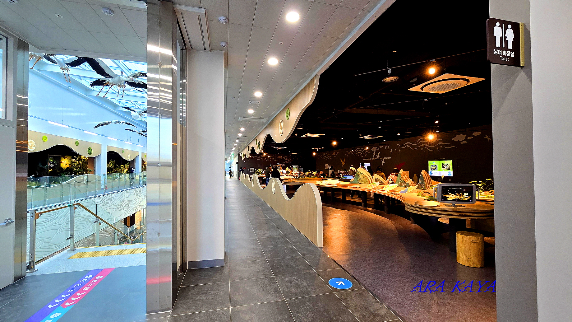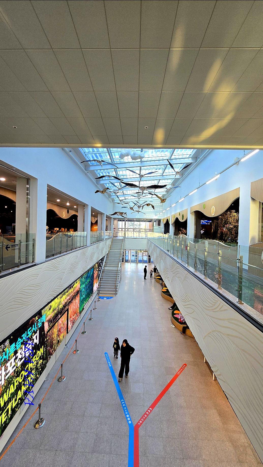 - 1층: 기획전시실, 상설·특별전이 열리는 전시 공간과 생태교육실이 배치되어 있으며, 어린이·시민 대상 강연·체험 프로그램이 이루어지는 교육의 중심층이다. 로비에는 안내데스크와 북라운지(작은 도서공간)가 있어 습지·철새 관련 도서를 읽으며 쉬어갈 수 있는 공간도 마련되어 있다.[blog.naver]