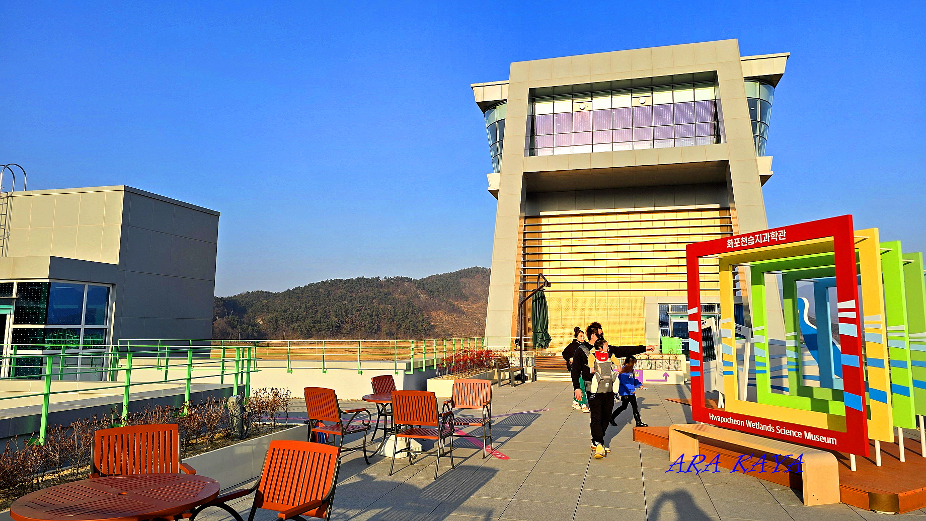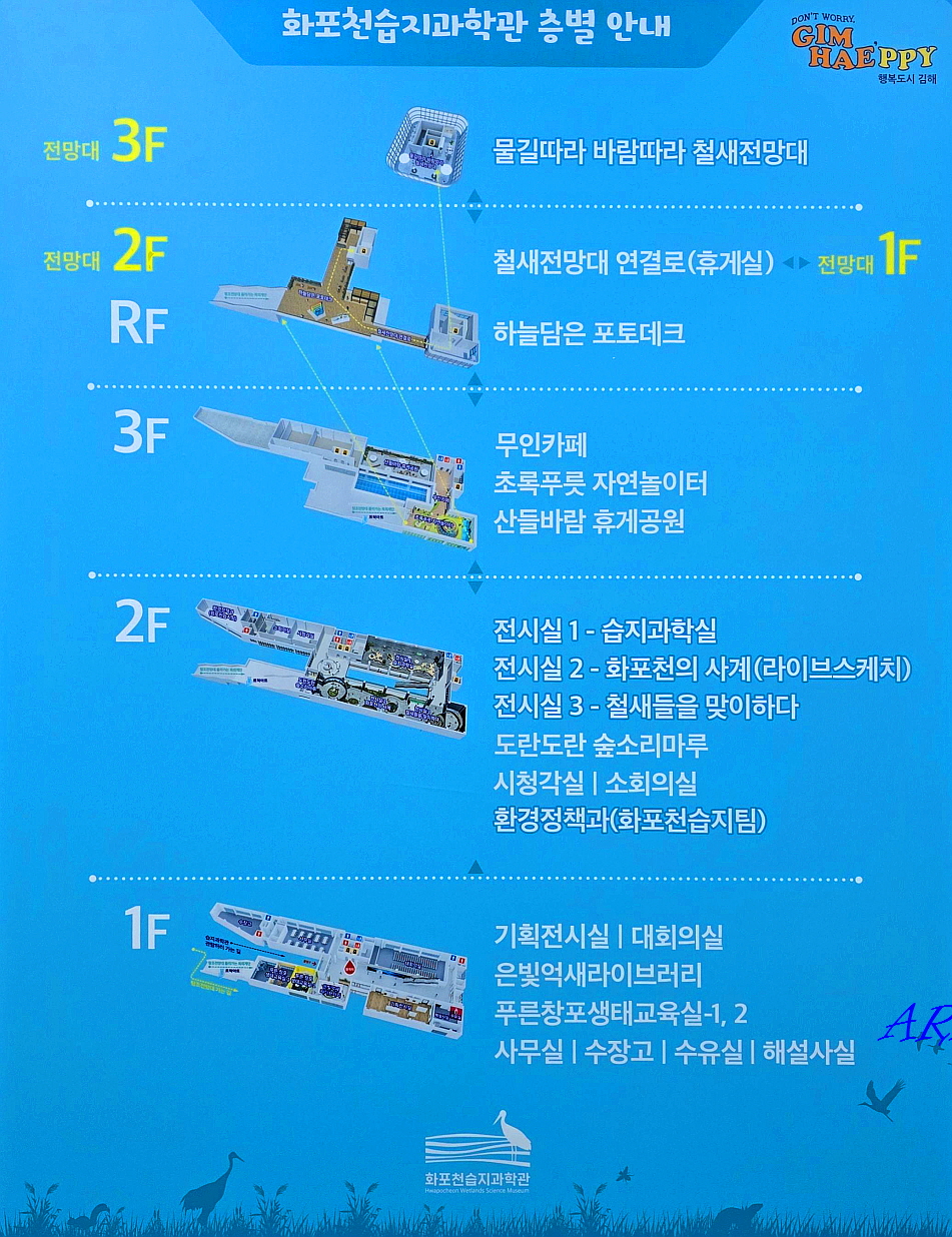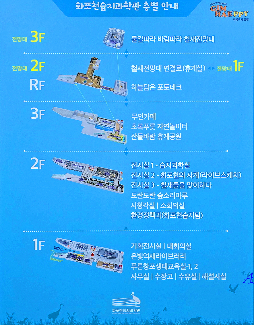 - 3층·옥상: 자연놀이터(초록푸릇 자연놀이터), 휴게공원(산들바람 휴게공간)과 옥상 포토데크·철새전망대가 있어, 아이들은 놀이를 즐기고 어른들은 습지 풍경과 철새를 조망할 수 있는 층이다. 옥상 전망 데크에서는 화포천 습지와 주변 논·산지까지 한눈에 들어와, 겨울철 독수리·기러기류 탐조와 사진 촬영 포인트로도 활용된다.[dodosunny.tistory]
