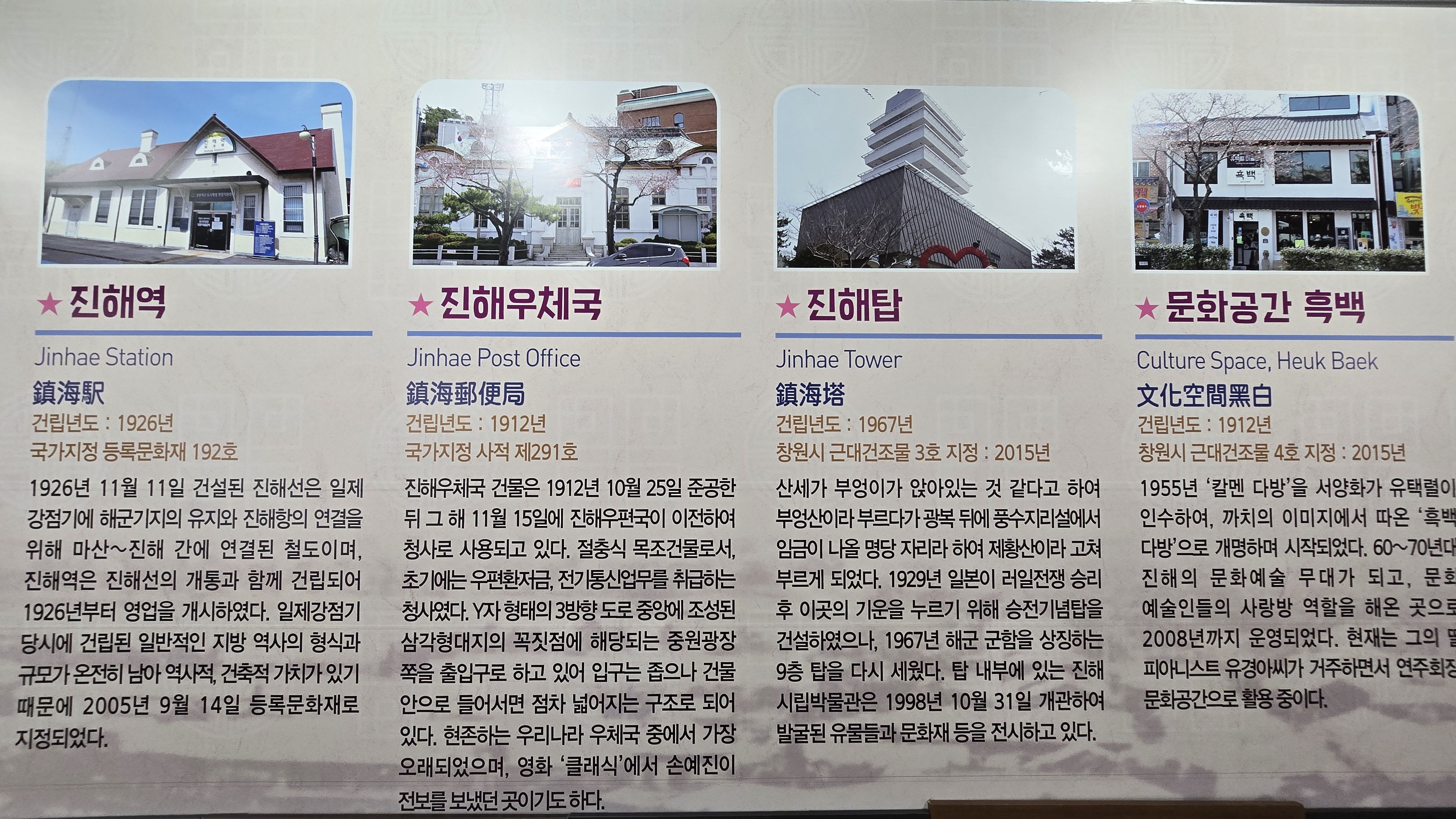 - 근대 역사 건축 모형·사진: 이순신장군 동상, 김구 선생 친필 시비, 진해역, 진해우체국, 진해탑, 문화공간 흑백, 수양회관, 선학곰탕 등 10여 곳 상세 소개.welfarehello+1
