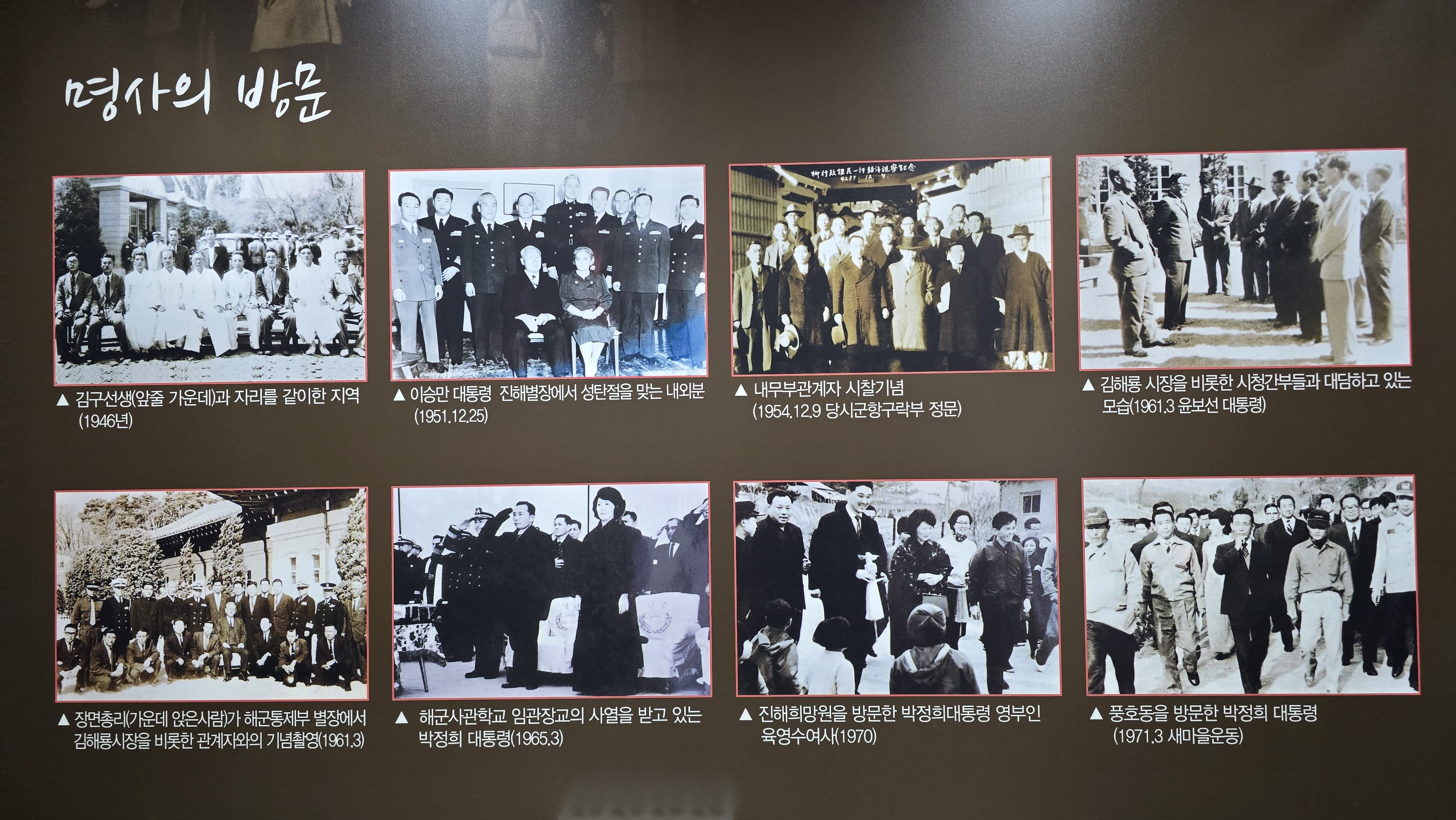 - 명사 방문 코너: 1946년 김구 선생 친필 시비 사진, 1951년 이승만·1971년 박정희 대통령 진해 방문 기록.[blog.naver]